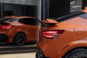 Vergessen Sie den knuffigen Look des normalen GV60. Der Magma sieht aus, als wäre er im Fitnessstudio gewesen – und hätte Steroide genommen. Die Kotflügel sind verbreitert. In den Radhäusern stecken riesige 21-Zoll-Schmiedefelgen mit Aero-Discs (zur Kühlung der Bremsen). Vorne gibt es riesige Lufteinlässe (die Technik braucht Luft!), hinten einen feststehenden Dachflügel und Finnen („Fins“) auf dem Dach, die den Luftstrom leiten. Er kauert 40 mm tiefer über dem Asphalt. In der Signature-Farbe Magma Orange ist er der absolute Blickfang. Ein Porsche Macan Electric wirkt daneben fast konservativ. Das Detail: Die Radlaufverbreiterungen sind nahtlos in die Karosserie integriert, nicht drangeklebt. Das wirkt extrem hochwertig.