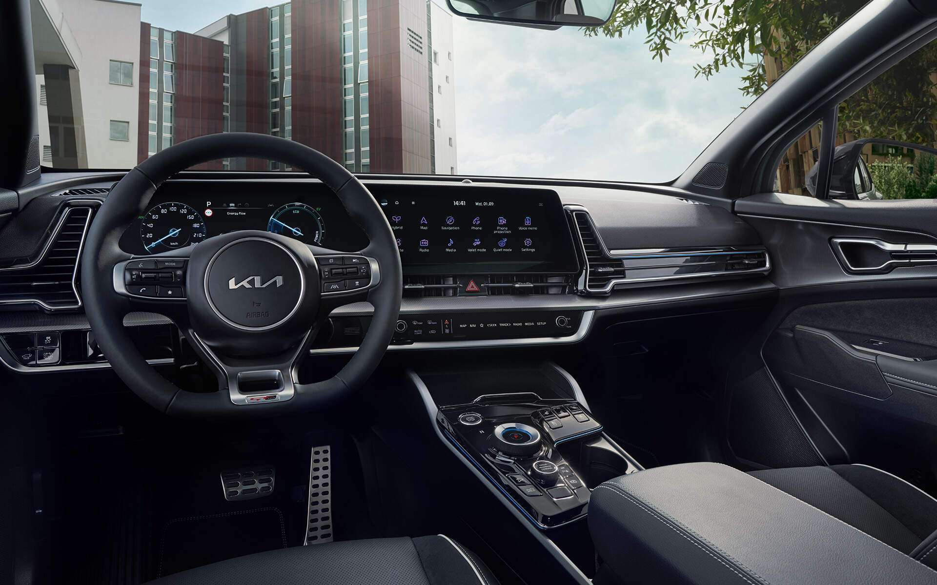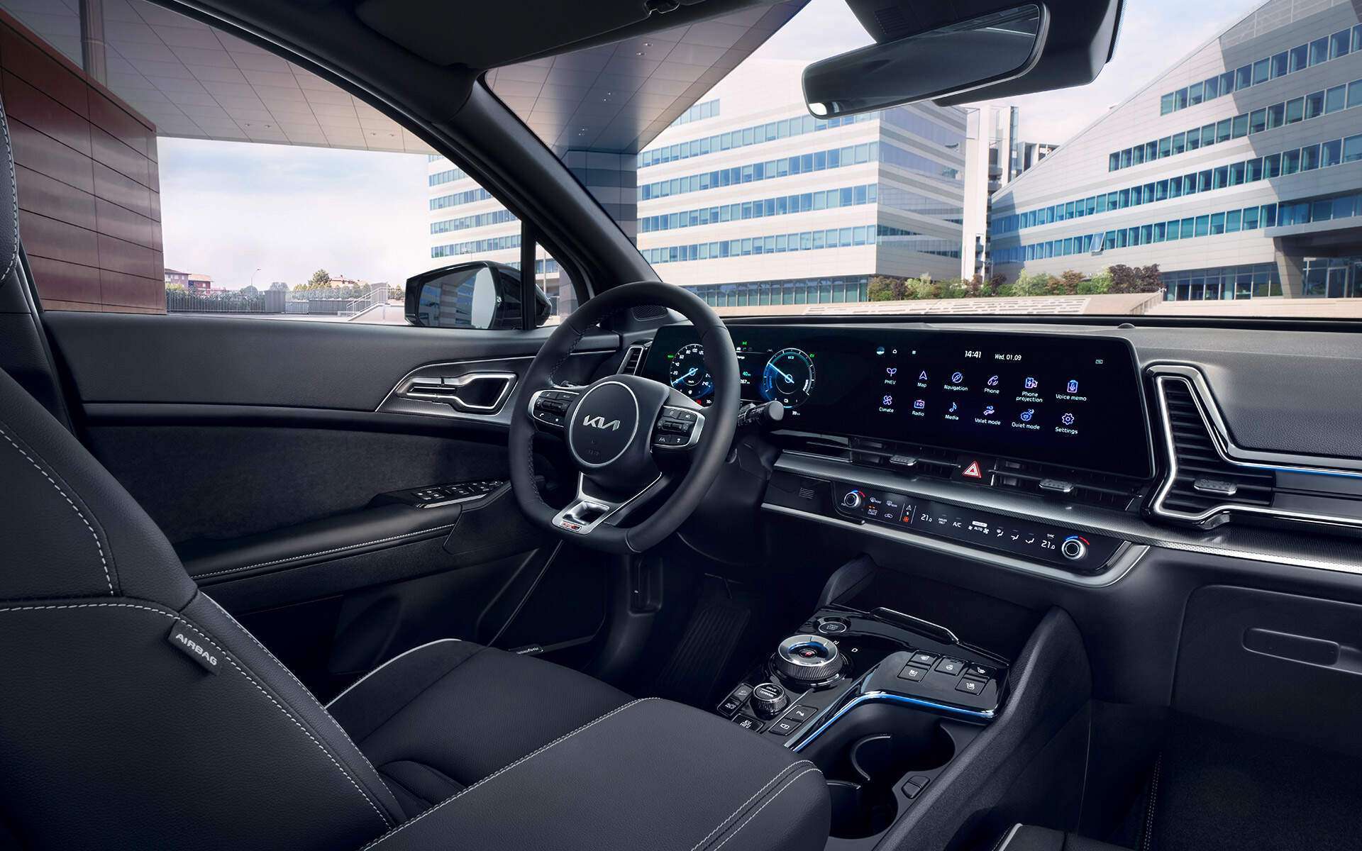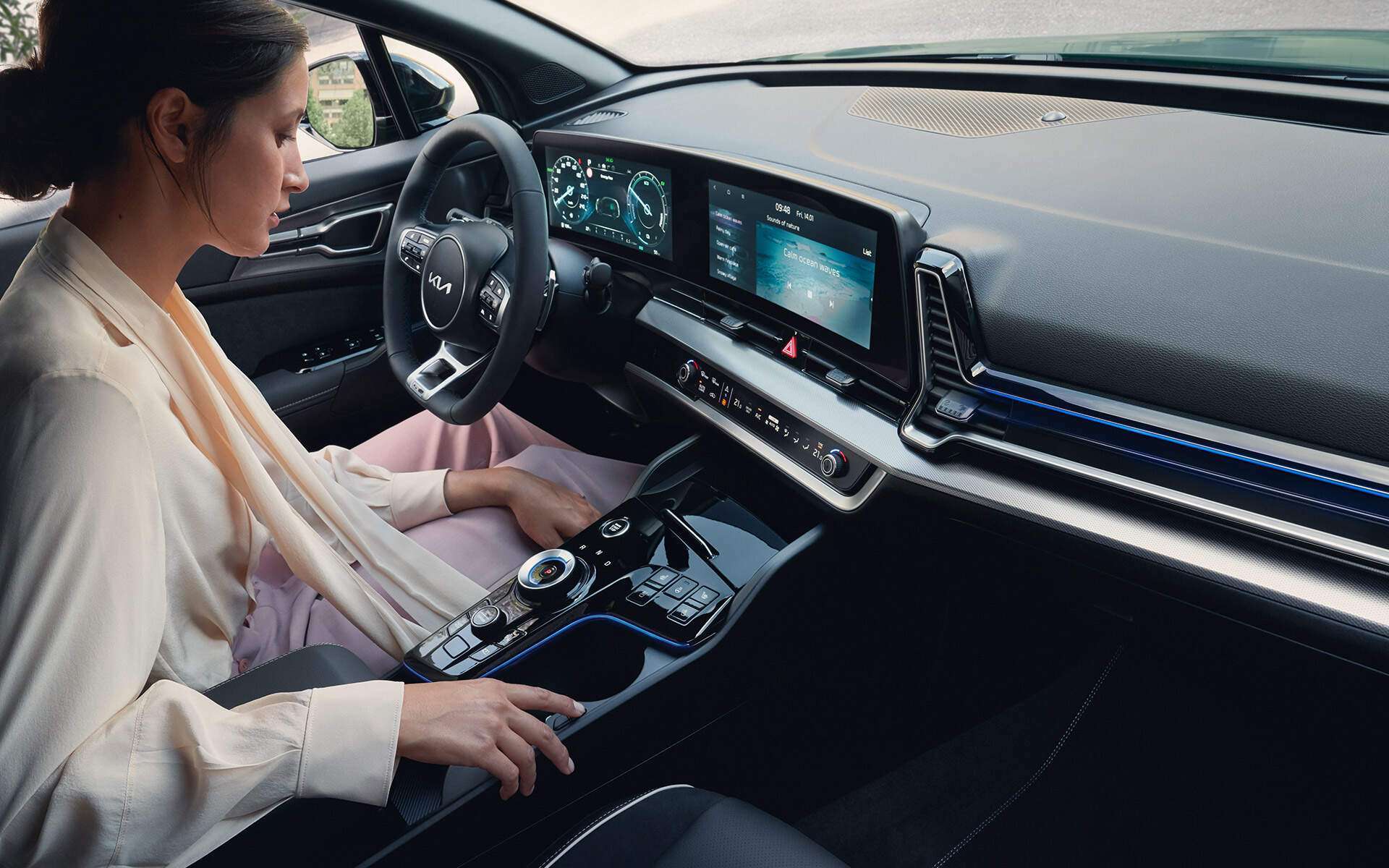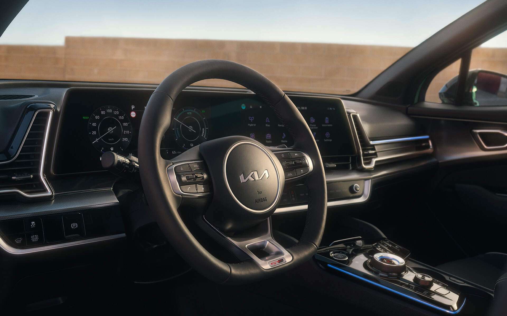 Im Cockpit hat Kia einen riesigen Sprung nach vorne gemacht. Das Highlight ist das elegant gebogene Panorama-Display, das zwei 12,3-Zoll-Bildschirme für die digitalen Instrumente und das Infotainment nahtlos miteinander verbindet. Die Bedienung ist durchdacht: Eine umschaltbare Touch-Leiste unterhalb des Hauptbildschirms steuert wahlweise die Klimatisierung oder die Medienfunktionen – eine clevere Lösung. Die Verarbeitungsqualität ist hoch und die Materialien fühlen sich gut an.