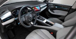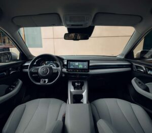 Hier merkt man das Alter. Die Software ist nicht so snappy wie im MG4. Die Grafik wirkt etwas pixelig. Aber: Es funktioniert. Apple CarPlay und Android Auto sind (kabelgebunden) an Bord. Die Sitze sind bequem, wenn auch etwas weich. Die Materialanmutung ist „ehrlich“ – viel Hartplastik, aber sauber verarbeitet. Es klappert nichts. Es ist ein Auto zum Benutzen, nicht zum Streicheln. Ein Highlight ist die V2L-Funktion (Vehicle-to-Load). Sie können am Ladeport (vorne in der Nase) einen Adapter anschließen und E-Bikes laden oder Kaffee kochen. Das macht den MG5 zum perfekten Camping-Begleiter.