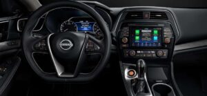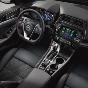 Das Design des Maxima ist auch 2026 noch ein Hingucker. Das „Floating Roof“ (schwarze C-Säule), der tiefe V-Motion Grill – er sieht aggressiv aus. Innen geht es weiter. Das Cockpit ist fahrerorientiert, die Mittelkonsole neigt sich dem Piloten zu (ähnlich wie im GT-R). Das Highlight sind die Sitze. In der „Platinum“-Ausstattung bekommen Sie diamant-gestepptes „Ascot“-Leder. Und natürlich die Zero Gravity Sitze. Sie sind bequem wie ein Fernsehsessel, bieten aber im SR-Modell genug Seitenhalt. Das Infotainment (8 Zoll Touchscreen) wirkt 2026 etwas klein und altbacken, aber es hat physische Drehregler und Tasten. Für viele Gebrauchtwagenkäufer ist das ein Vorteil: Keine Touch-Bedienung für die Klimaanlage! Apple CarPlay und Android Auto sind (kabelgebunden) an Bord, das reicht zum Überleben. Platz hinten? Es ist eine „Full-Size Sedan“, aber das abfallende Dach kostet Kopffreiheit. Zwei Erwachsene sitzen gut, für drei wird es eng. Der Kofferraum ist tief, aber die Ladeluke ist typisch Limousine – sperrig.